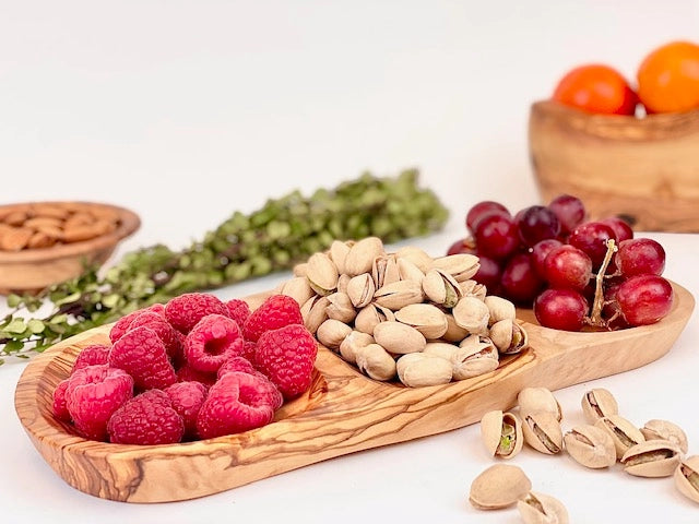 Prized for its density and durability, the wood of olive trees has unique, striking grain that yields one-of-a-kind pieces every time. The natural oils found in olive wood are antibacterial, and the very tight grain of the wood keeps bacteria from becoming trapped, which maintains the aesthetic for years to come. Elevate your hosting with beautiful, functional serveware!