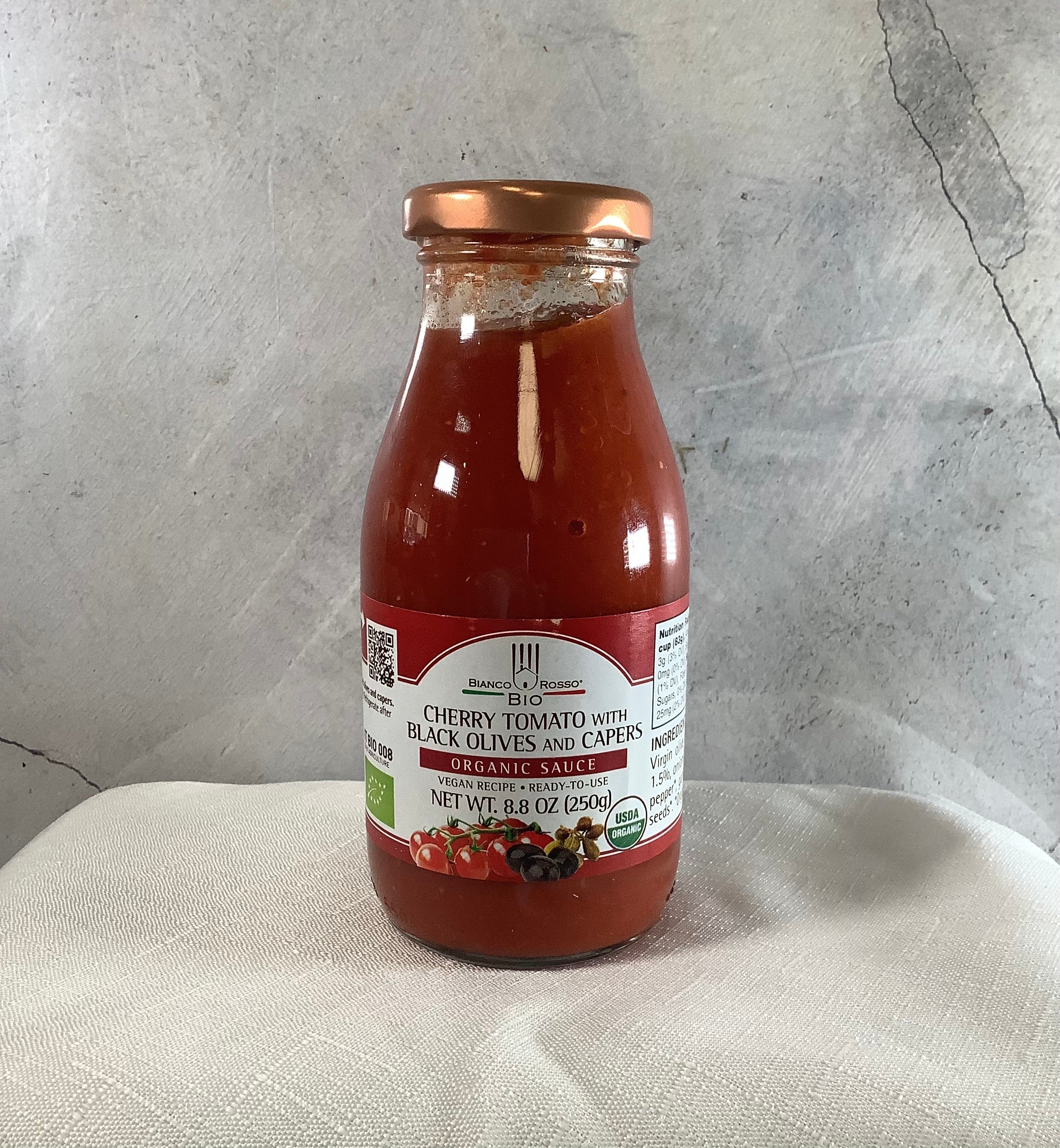 This tomato sauce has the sweet and tangy flavor of cherry tomatoes as well as the savory taste of black olives and capers. A fantastic addition to your favorite pasta sauces!